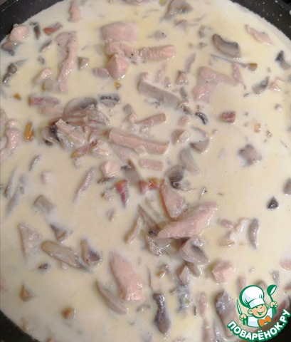 Как только смесь из курицы грибов и ветчины останется без сока от грибов, добавляем сливки. Перемешиваем и провариваем несколько минут до загустения сливок.