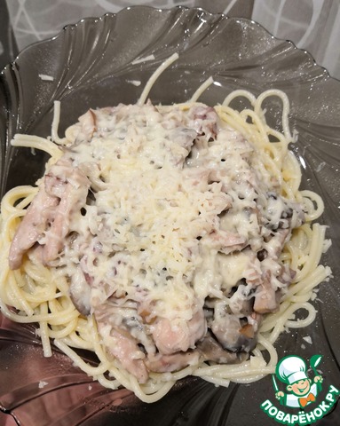 Рецепт «Спагетти с курицей, ветчиной и грибами»: