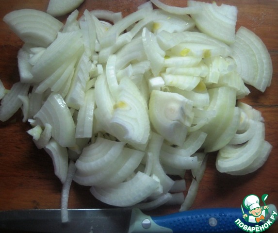 Тем временем приготовим грибную подливу. Нарезаем лук четвертькольцами.
