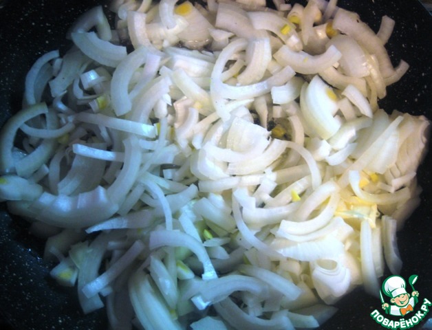 На сковороде разогреваем сливочное и растительное масло. Добавляем лук и на среднем огне обжариваем до золотистого цвета лука.