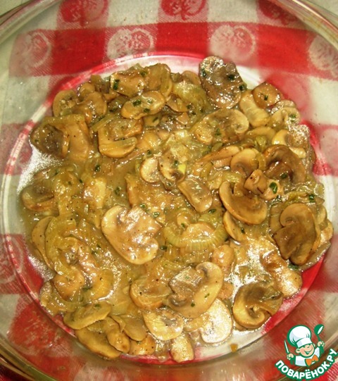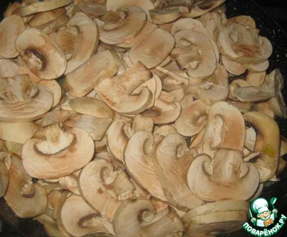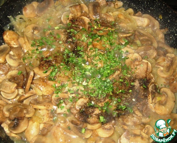 Добавляем их в сковороду к луку, перемешиваем, накрываем крышкой и на маленьком огне тушим 8-10 минут, чтобы шампиньоны отдали сок. Не забываем периодически помешивать подливу.