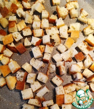 Далее готовим сухарики. В разогретой сковороде обжарить на масле чеснок до золотистого цвета. Затем хлеб нарезать на квадратики, положить в сковороду и обжарить также до золотистого цвета.