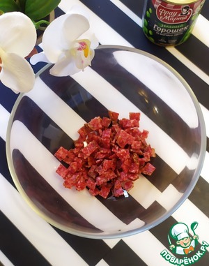 Приступим к салату: Колбасу очистить от оболочки и нарезать мелкими кубиками. Выложить в большую чашу для удобства.