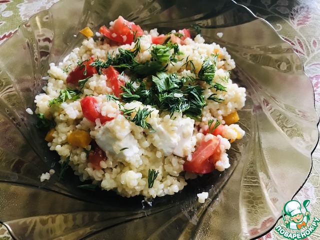 В миску всыпать булгур, залить его кипятком так, чтобы он полностью был им покрыт и оставить на 20 минут, чтобы крупа впитала воду. Я булгур отварила согласно инструкции на упаковке.