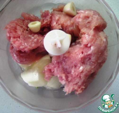 В чаше блендера соединить куриный фарш, кусочки репчатого лука и чеснока, яичный белок. Тщательно смешать блендером. -