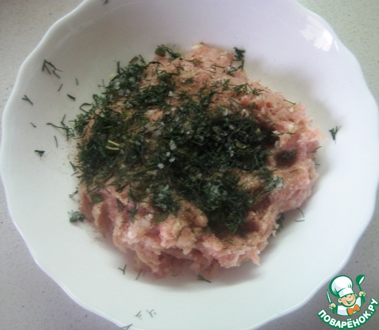 Приправить фарш по вкусу солью и черным перцем, добавить измельченный укроп, тщательно перемешать.