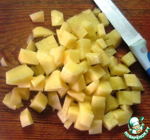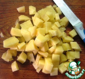 картофель нарезать небольшими кусочками и отправить в кастрюлю с водой, довести до кипения, уменьшить огонь. -