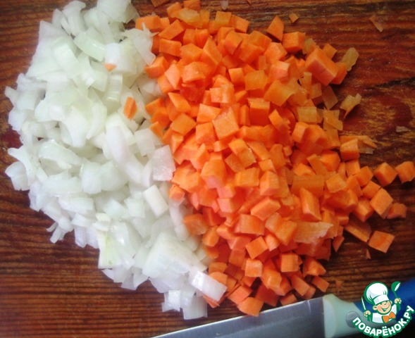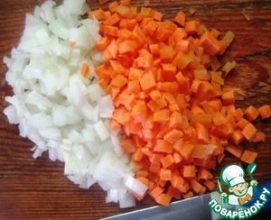 Мелко нарезать лук и морковь. На сковороде разогреть небольшое количество растительного масла и отправить их обжариваться на среднем огне до золотистого цвета лука и мягкости моркови.