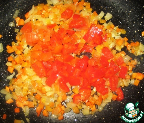 Небольшими кусочками нарезать сладкий перец, отправить его в сковороду к моркови с луком. Обжаривать всё вместе 2-3 минуты, не забывая помешивать.