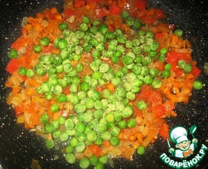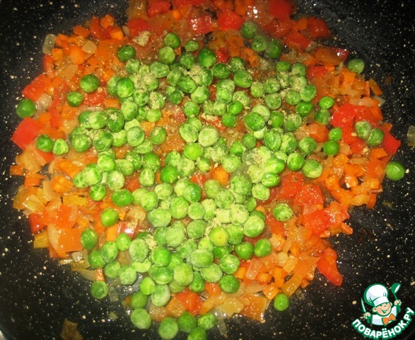 Добавить зеленый горошек (предварительно не размораживала), приправить овощи солью и черным перцем по вкусу, обжаривать овощи еще 1-2 минуты и снять сковороду с огня.