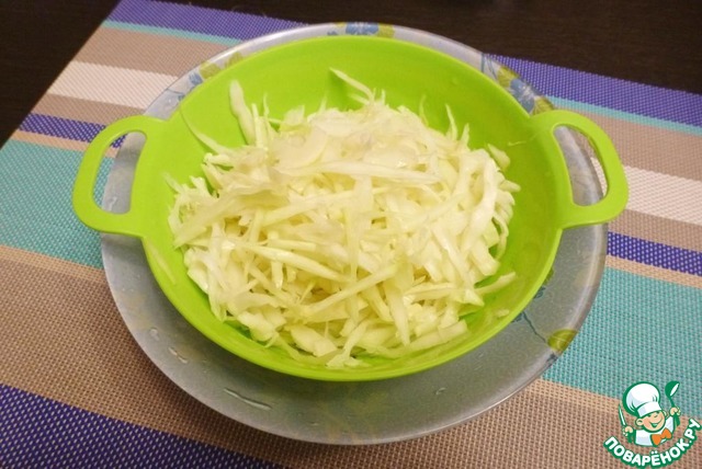 Капусту откинуть на дуршлаг, затем отжать её от влаги.