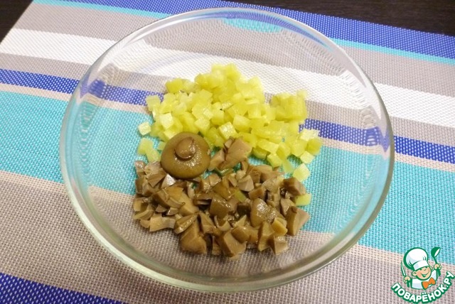Соленые огурцы очистить от шкурки и нарезать на кубики. Маринованные грибы (у меня моховики) нарезать небольшими кусочками.