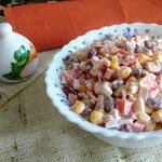 Этот салат был вычитан в каком-то из журналов с рецептами от читателей, в изобилии хранящихся в саду. Он настолько простой и по приготовлению, и по составу, что его может сделать даже ребенок. А уж для любителей консервов ТМ "Фрау Марта"- это настоящий праздник! Для постного варианта крабовые палочки можно заменить помидорами.