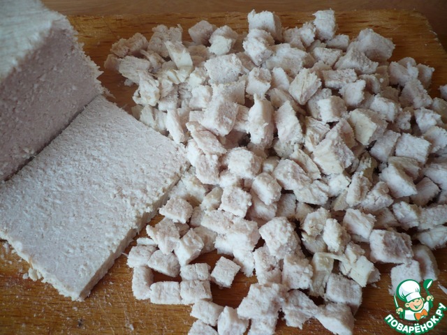 Отварите мясо свинины (у меня карбонат) до готовности, в немного подсоленной воде. Дайте мясу остыть и нарежьте мелкими кусочками.