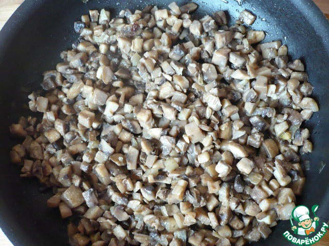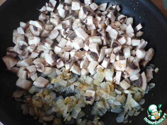 Шампиньоны также нарезать мелкими кубиками и добавить к луку. Обжариваем до готовности, затем посолить по вкусу.