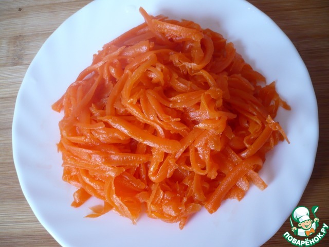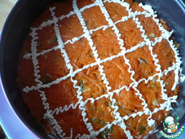 3-ий слой - выкладываем морковь, делаем сеточку из майонеза.