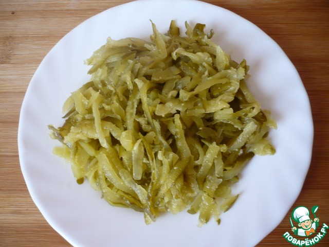 На крупной терке натрите маринованные огурцы. Затем огурцы хорошо отжать от жидкости.