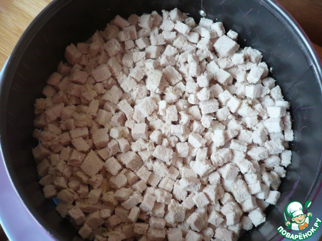 1-ый слой выкладываем нарезанное мясо свинины, сверху делаем сеточку из майонеза. -