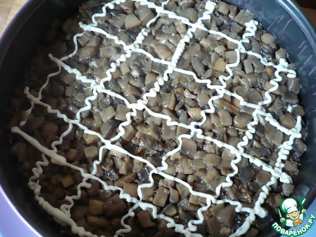 4-ый слой - обжаренные шампиньоны с луком и сверху сеточка из майонеза.
