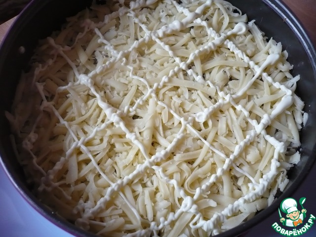 5-ый слой - натертый сыр, сверху делаем сеточку из майонеза.