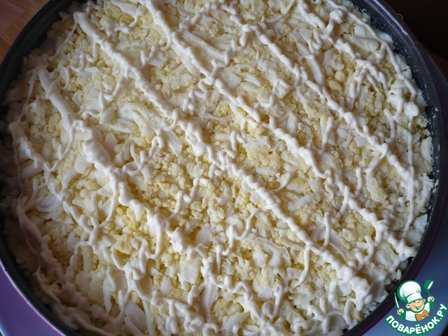 7-ой - последний - слой - выкладываем натертые яйца и наносим сеточку из майонеза.