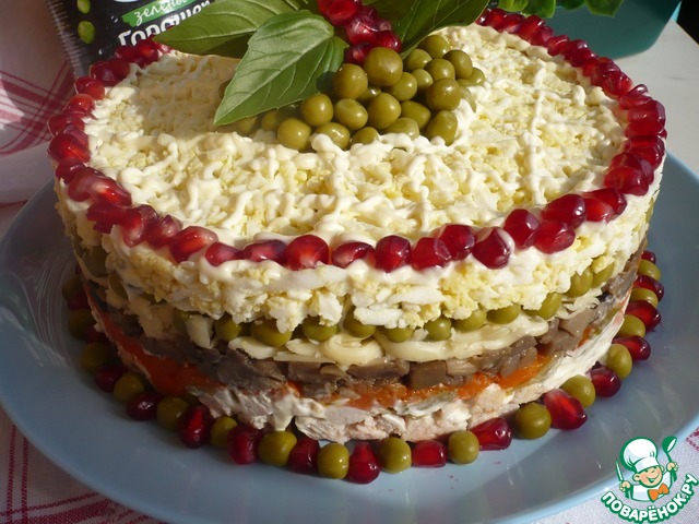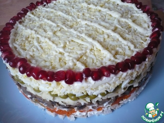 Теперь аккуратно снять кулинарное кольцо. По желанию салат можно украсить зеленью, зернами граната, зеленым горошком. Дайте салату немного пропитаться и подавайте к столу.