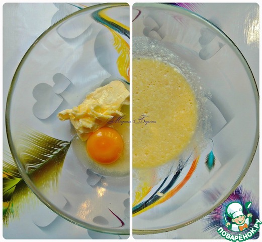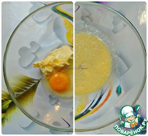 В миске смешать яйцо, мягкое сливочное масло и сахар с помощью венчика для объединения.