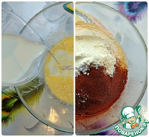 Далее влить молоко и размешать. Затем непосредственно в смесь просеять сухие ингредиенты: пшеничную муку, разрыхлитель и какао, перемешать венчиком.