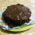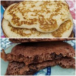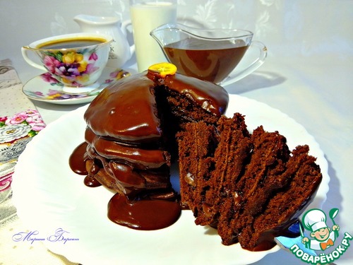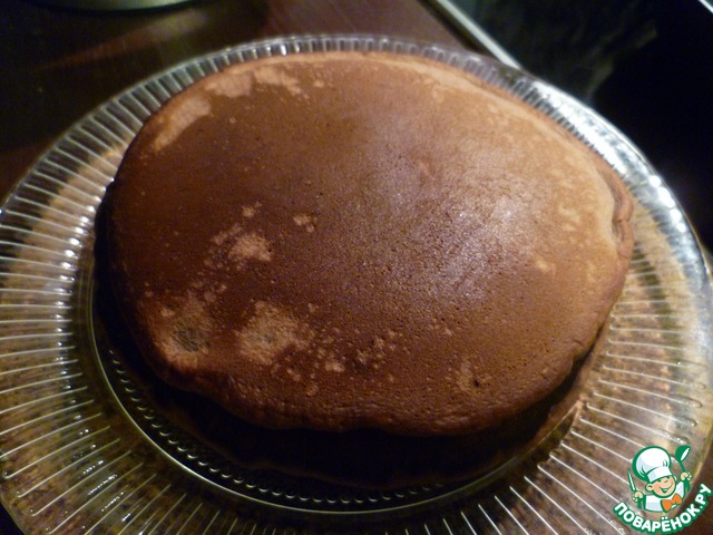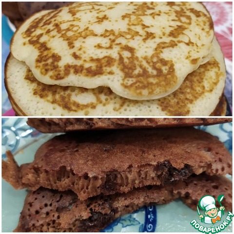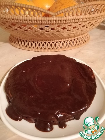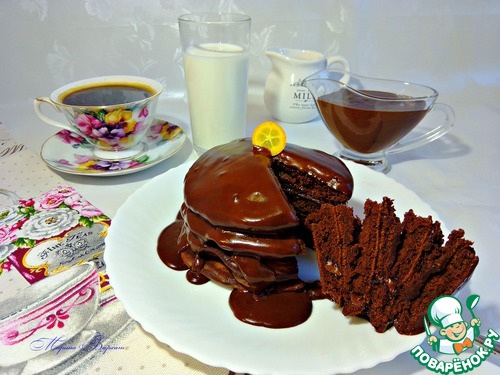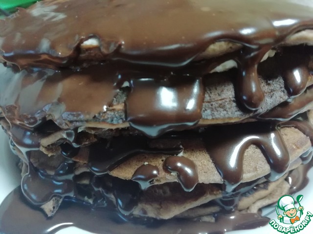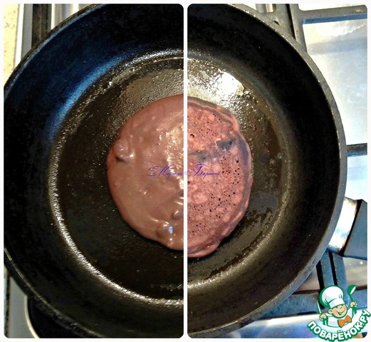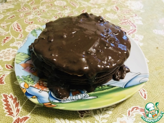 Я в центр сковороды выкладывала примерно две столовые ложки теста, слегка выравнивая по кругу диаметр 10 см, в процессе они увеличивались до 12 см. Тесто как для толстых блинов густое, но жиже чем для оладьев. На весь диаметр сковородки, а она у меня кажется 20-22см, не растягивала, чтобы было удобно переворачивать. И да, они не должны быть тонкими, примерно 1 сантиметр теста, в процессе выпечки увеличивается. Вот таким способом получилось 9 блинов. Они довольно сытные! Вот стопочку из 4-х на фото, я прослоила чучуть шоколадным соусом и щедро полила сверху. Разделили на четыре порции, было вкусно, сытно и мега шоколадно! Остывшие можно разогревать до теплого состояния (в СВЧ или на сковороде под крышкой). С абрикосовым джемом и шоколадным соусом - почти торт "Прага".