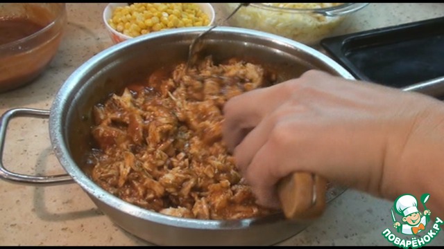 Когда курица немного остынет порежем её на волокна и перемешаем с соусом, в котором она тушилась. она получается очень вкусная и сочная. Я резала прямо в сковороде, у меня она без антипригарного покрытия. Я готовила пирог с кукурузой, но можно ещё взять замороженную мексиканскую смесь, добавить к курице с соусом и потушить.
