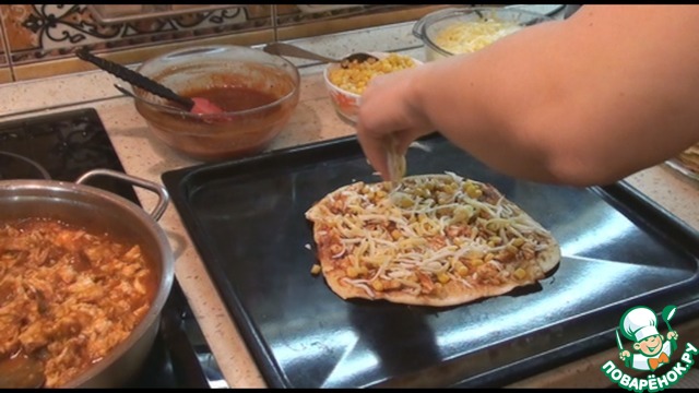 Собираем пирог-торт: середину противня немного смажем кетчупом и растительным маслом, выкладываем лепешку, смажем с помощью кисточки соусом, выкладываем мясо, сверху кукурузу и натертый сыр.