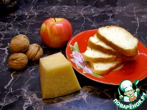 Яблоко порежем тонкими пластинками, сыр натрем на крупной терке, орехи измельчим, кусочки хлеба слегка смажем сливочным маслом.