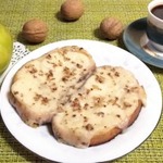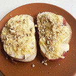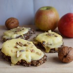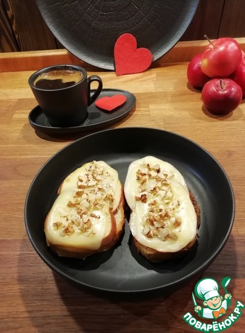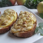 На хлеб выложим пластинки яблок, а на них - тертый сыр. Поджарим бутерброды на разогретой сковороде, не до конца прикрытой крышкой. Когда сыр начинает плавиться, сверху посыпаем орехами.