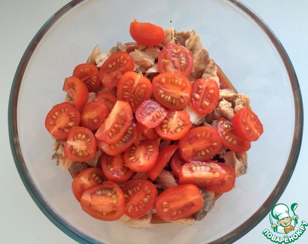 Помидоры черри помыть, разрезать на половинки, добавить в салатник.