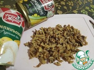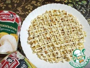 Шампиньоны ТМ Фрай Марта промываем и произвольно нарезаем. Выкладываем на тарелку и промазываем слой майонезом.