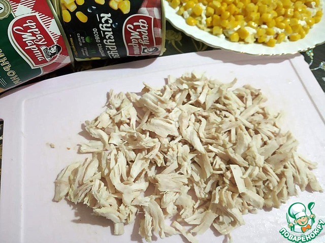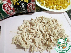Отваренную в подсоленной воде грудку индейки разделяем на короткие волокна. Делаем из неё следующий слой и также промазываем майонезом.
