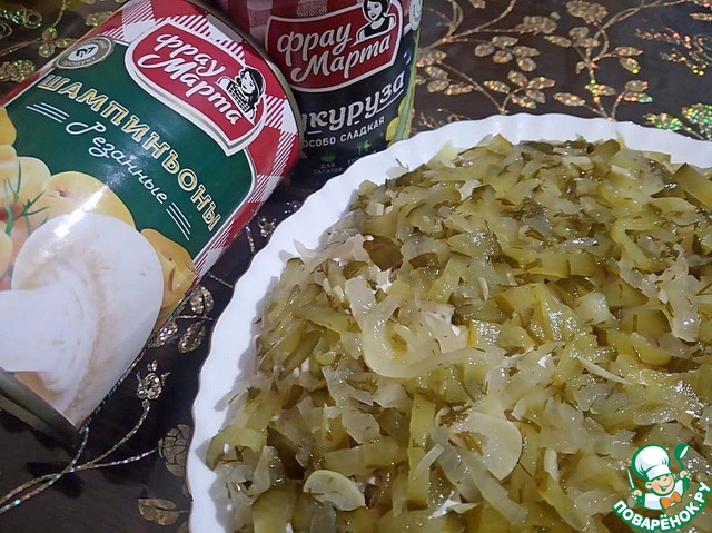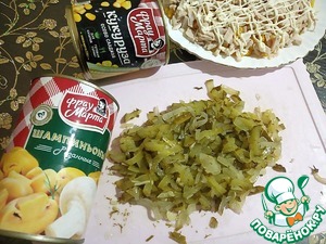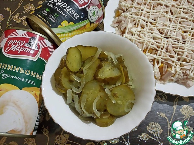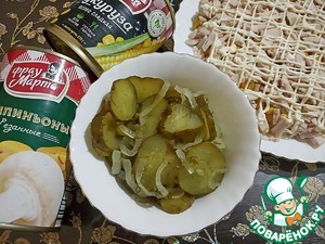 Для следующего слоя я решила использовать домашние маринованные огурцы с луком и укропом. По желанию, можно использовать любые.