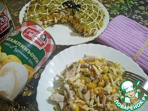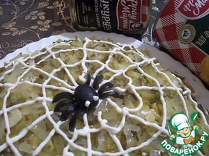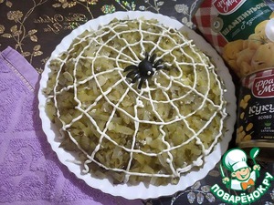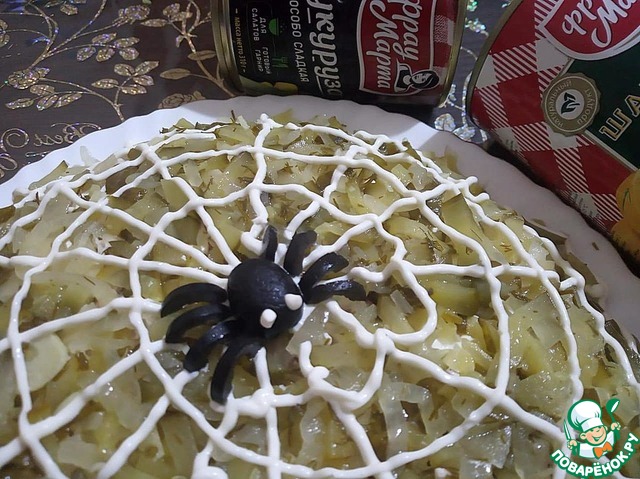 С помощью кондитерского мешка рисуем паутинку на поверхности салата. Разрезаем маслинку пополам. Из одной половинки делаем туловище паучка. Остальные половинки нарезаем на тонкие дольки и делаем из них лапки.