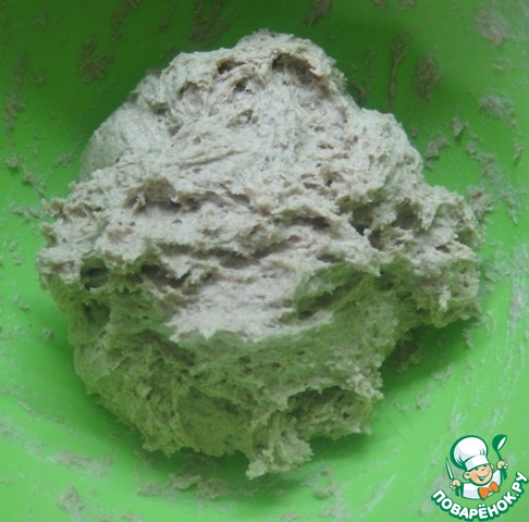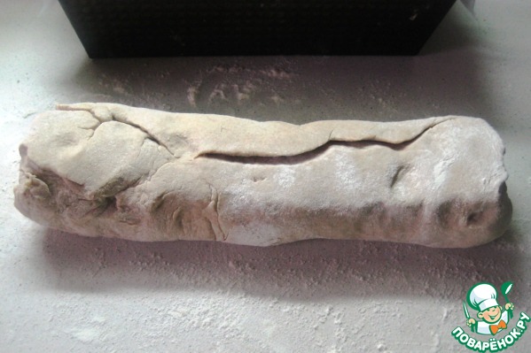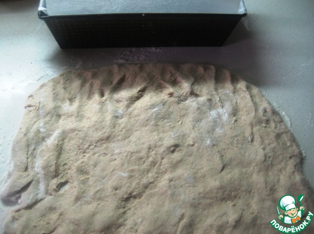 Я решила печь хлеб в прямоугольной форме (размер формы шир.11 см, выс. 7 см, дл. 25 см). На поверхности руками растянуть тесто в пласт по длине формы. -