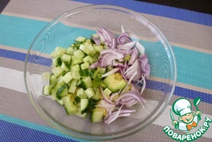 Сладкий лук нарезать перьями. Свежий огурец нарезать кубиками.