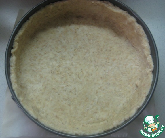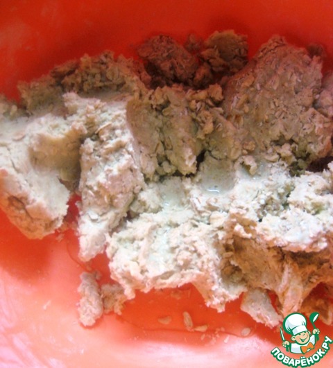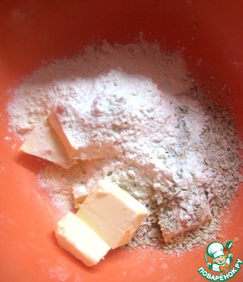 Овсяные хлопья измельчить блендером. В миске соединить кусочки сливочного масла, измельченные овсяные хлопья, муку и щепотку соли. Начать замешивать тесто руками. -