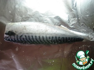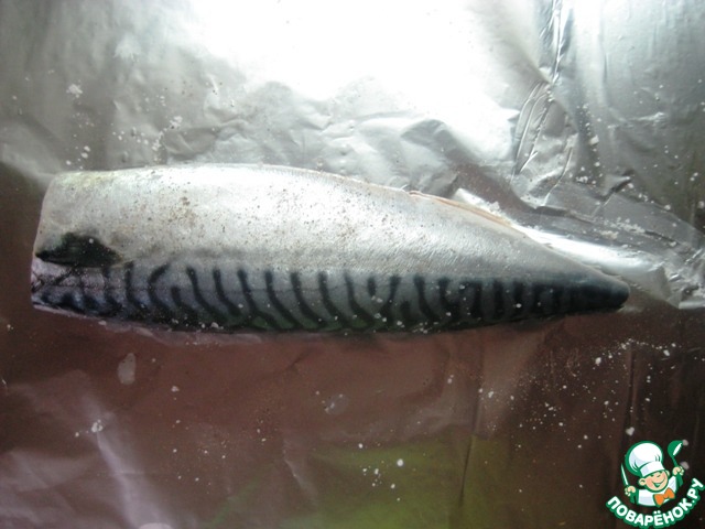 Скумбрию приправить солью и черным перцем, завернуть в фольгу и запечь в духовке до готовности. -