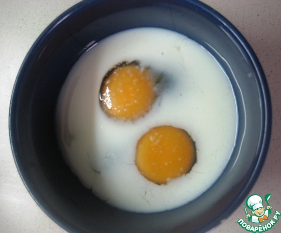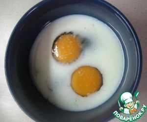 Заливка: в мисочке соединить молоко и яйца, добавить щепотку соли и тщательно взбить вилочкой.
