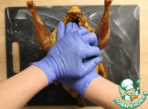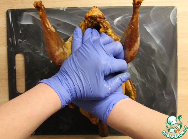 Достаем из холодильника даем стечь вину, Продавливаем грудку чтобы не сгорела.