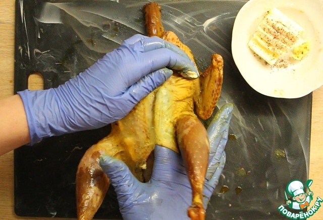 Аккуратно поднимаем кожицу над мясом где это возможно сделать, кладем масло со смесью перцев и солью.