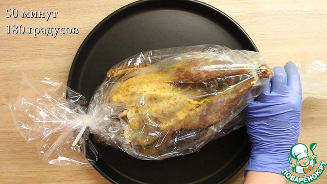 Кладем в рукав для запекания, ставим в разогретую духовку до 180 градусов на 35 минут, после 35 минут без пакета еще 15 минут.