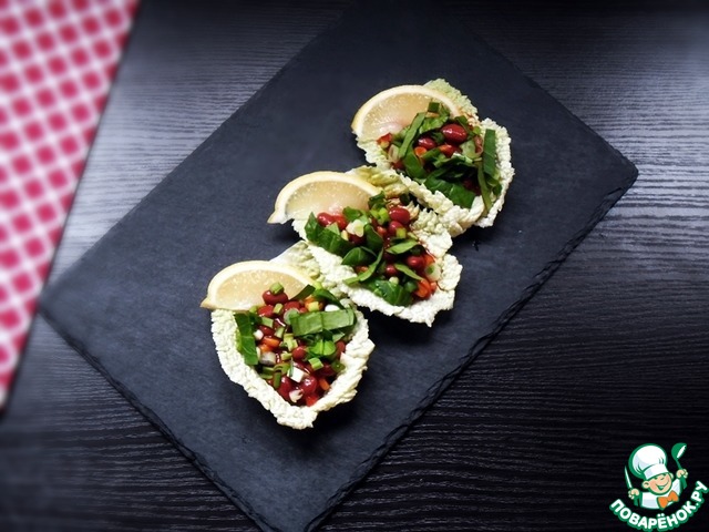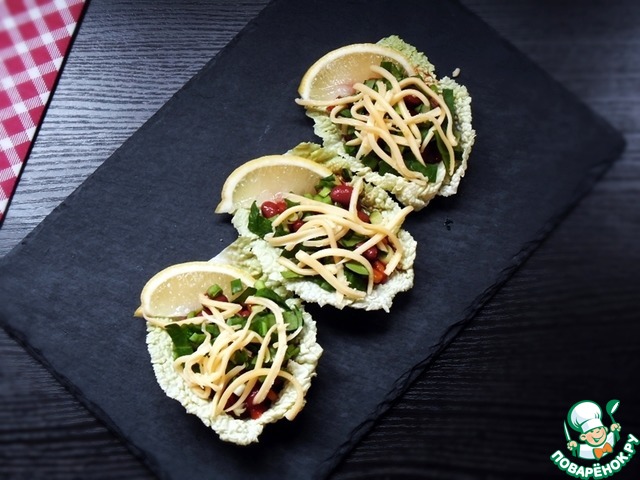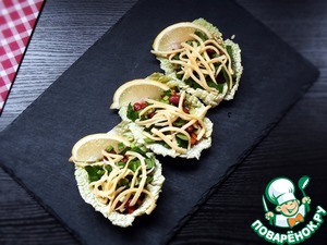 От капусты отделить три небольших, не поврежденных листа. Отрезать утолщенную часть, так чтобы получилось подобие тарелочки.