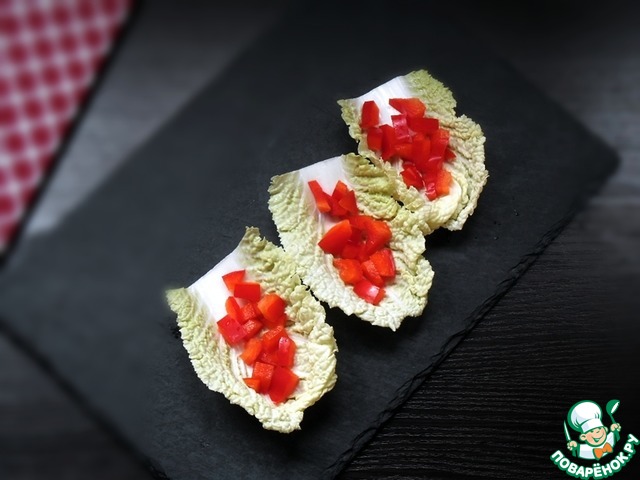 Выложить листья на тарелку или доску для подачи, на дно каждого листа разложить подготовленный болгарский перец.