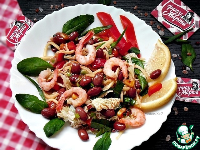 Отварите фасоль, соедините с кукурузой и болгарским перцем, залейте..., а можно поступить проще! Возьмите баночку овощной смеси от ТМ Фрау Марта и горсть креветок, ваш великолепный салат уже почти готов. Ещё немного свежих овощей и можно подавать вкусный, сытный салат!