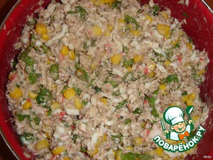 Приготовить фарш, смешав раздавленные вилкой сардины, натертые на крупной терке крабовые палочки и яйца, зелень, кукурузу и майонез. Приправить солью и перцем по вкусу.